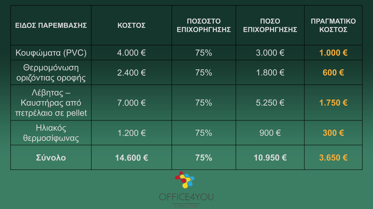 Ενδεικτικά αναφέρουμε ένα παράδειγμα για την ευκολότερη κατανόηση των παραπάνω κριτηρίων. Εξετάζονται οι προδιαγραφές ενός διώροφου σπιτιού 100τ.μ μιας οικογένειας που εντάσσεται στην δεύτερη κατηγορία με ετήσιο εισόδημα 35.000€ σε μη λιγνιτική περιοχή και επομένως λαμβάνει επιχορήγηση 75%. Η κατανάλωση του σπιτιού σε ρεύμα είναι 200kw/h το μήνα, διαθέτει πέντε ξύλινα παράθυρα, δύο μπαλκονόπορτες ξύλινες, καυστήρα πετρελαίου. Το συγκεκριμένο οίκημα επιθυμεί αλλαγές σε κουφώματα, θερμομόνωση οροφής, αλλαγή συστήματος λέβητα – καυστήρα σε pellet, εγκατάσταση ηλιακού θερμοσίφωνα 140lt όπως φαίνονται στο παρακάτω πίνακα. Οι τιμές κόστους για τις παρεμβάσεις είναι ενδεικτικές και κοντά σε ρεαλιστικά δεδομένα.